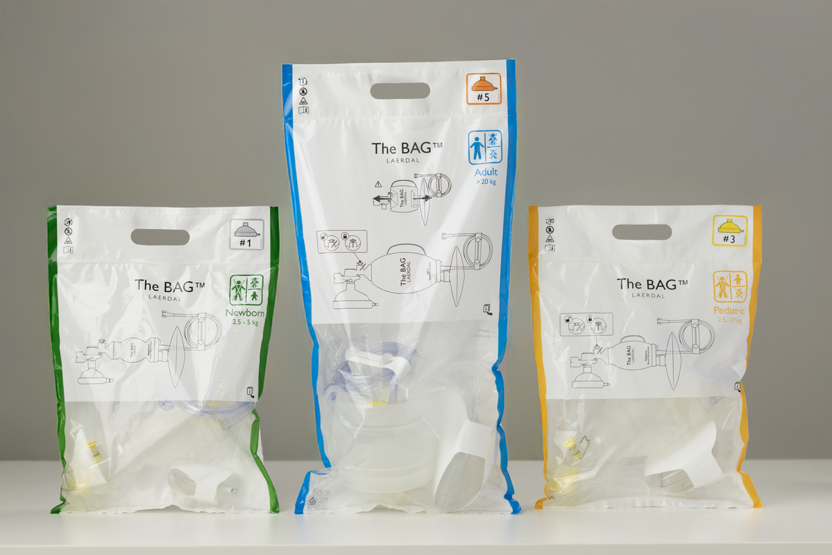 Laerdalin the BAG on kertakäyttöinen, itsestään täyttyvä manuaalinen elvytyspalje, jota on saatavilla kolmessa koossa – aikuinen, lapsi, vastasyntynyt